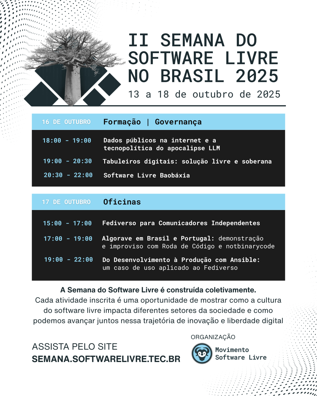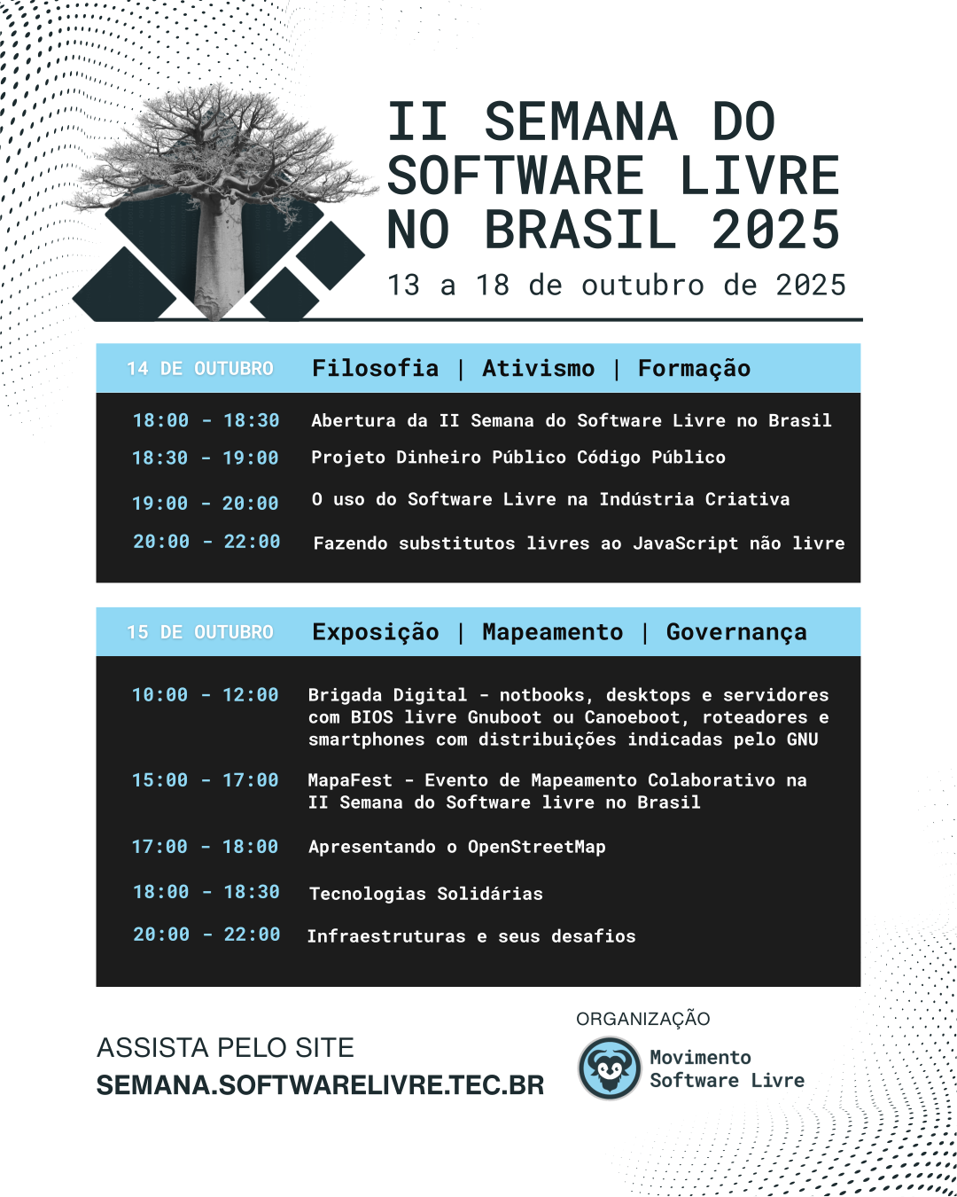 O evento acontecerá de 13 a 18 de outubro de 2025, com os objetivos de debater os rumos do Movimento Software Livre no país, deliberar sobre sua organização para o próximo ciclo e fomentar a realização de todo o seu potencial técnico, filosófico e cultural.